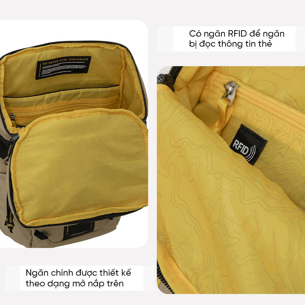 Ngăn chính được thiết kế theo dạng mở nắp trên, tiện lợi an toàn cho đồ đạc bên trong. Có ngăn RFID để ngăn bị đọc thông tin thẻ. Ngăn bên hông có độ co giãn để có thể để vật dụng linh hoạt