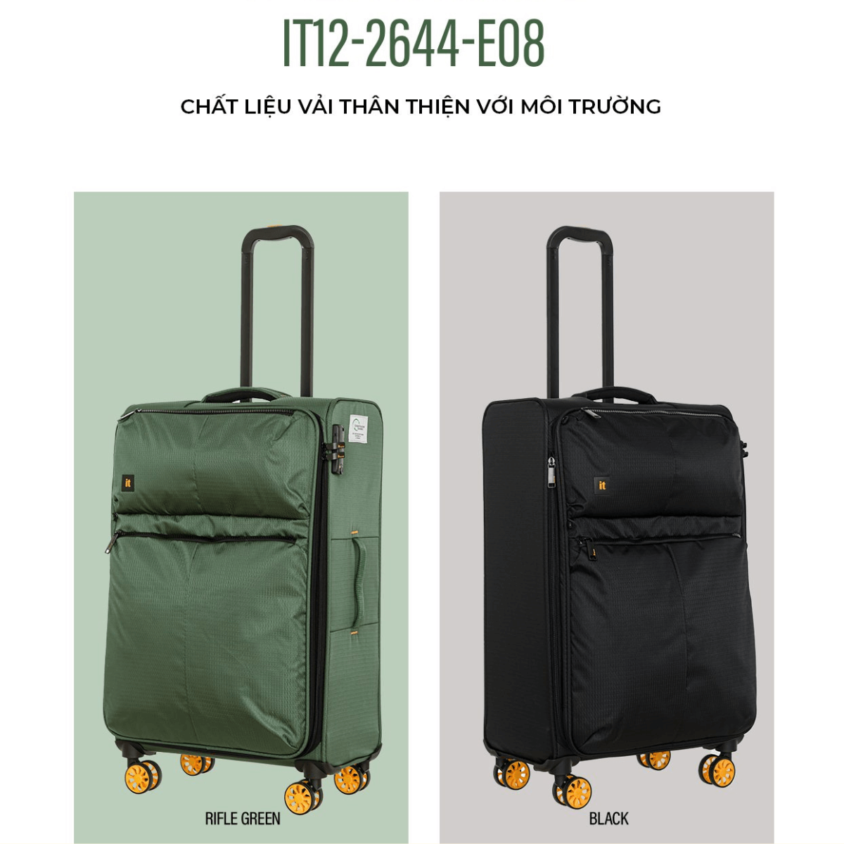 IT12-2644-E08 được gọi là vali thân thiện với môi trường, vì nó được làm từ chất liệu vải có nguồn gốc từ chai nhựa PET dùng một lần. Sau khi được tái chế, chúng sẽ trở thành một loại vải polyester bền, mang lại sức sống mới dưới hình dạng một chiếc vali IT12-2644-E08. Tem chứng nhận GRS được khâu một cách nổi bật bên ngoài như minh chứng cho sự uy tín của thương hiệu.