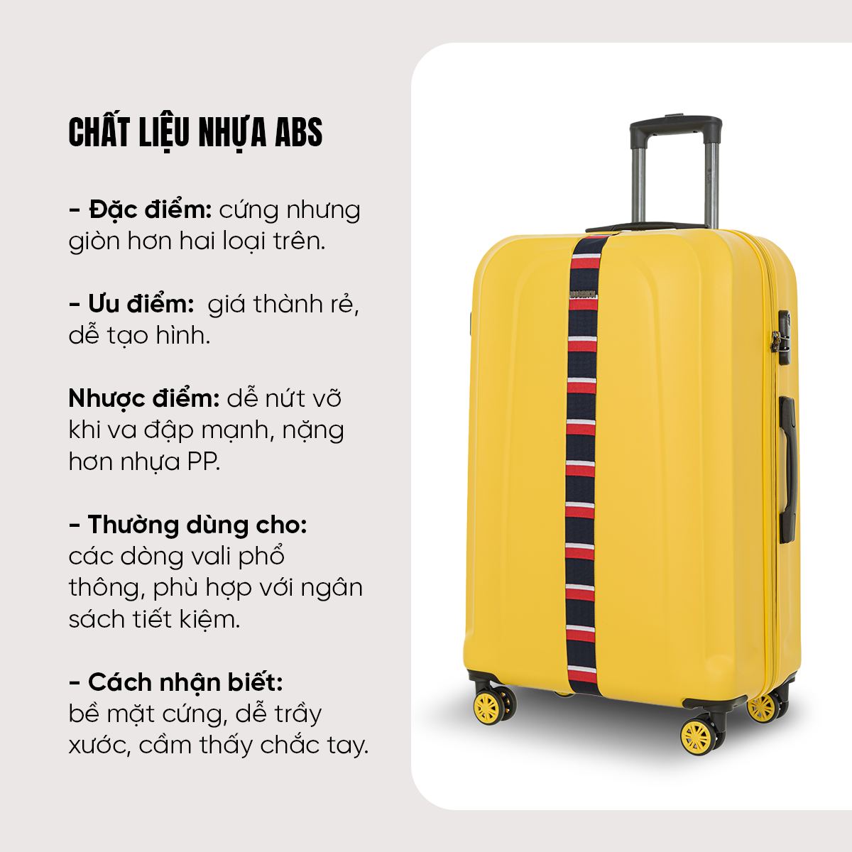 Ưu điểm lớn nhất của vali nhựa ABS là giá thành dễ tiếp cận, phù hợp với học sinh, sinh viên hoặc người ít di chuyển. Tuy nhiên, nhược điểm là khả năng đàn hồi kém hơn, dễ nứt vỡ nếu chịu va đập mạnh trong quá trình ký gửi.