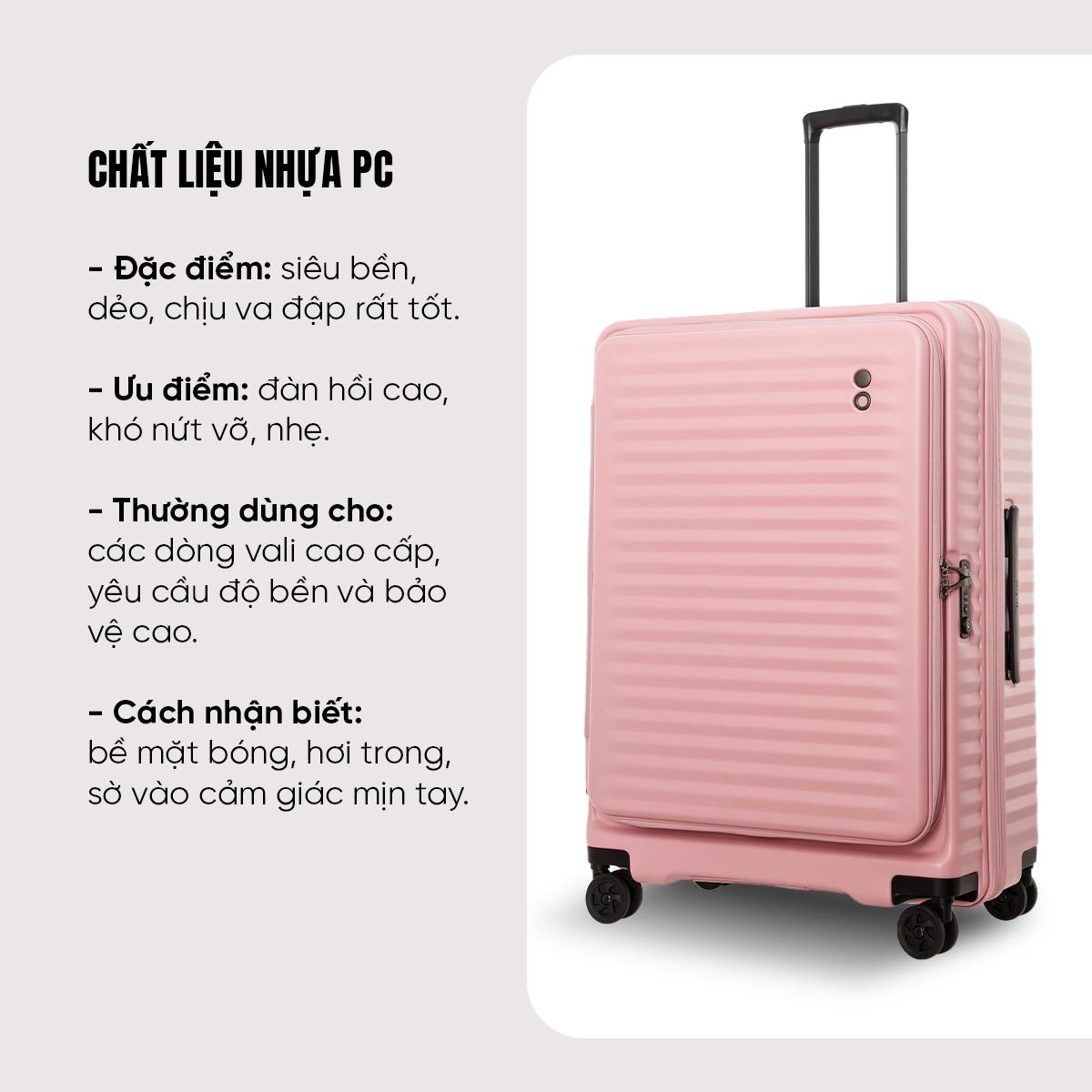 PC được xem là dòng nhựa cao cấp nhất trong ngành hành lý.Ưu điểm nổi bật của nhựa PC là vẻ ngoài thời trang nhờ bề mặt sáng bóng, độ hoàn thiện tỉ mỉ và cứng cáp ổn định. Đặc tính dòng nhựa này sở hữu độ bền cao, chống va đập vượt trội và bảo vệ hành lý tối ưu. Đổi lại, giá thành của vali PC thường khá cao, phù hợp với người thường xuyên đi công tác, du lịch dài ngày hoặc bay nhiều chặng.