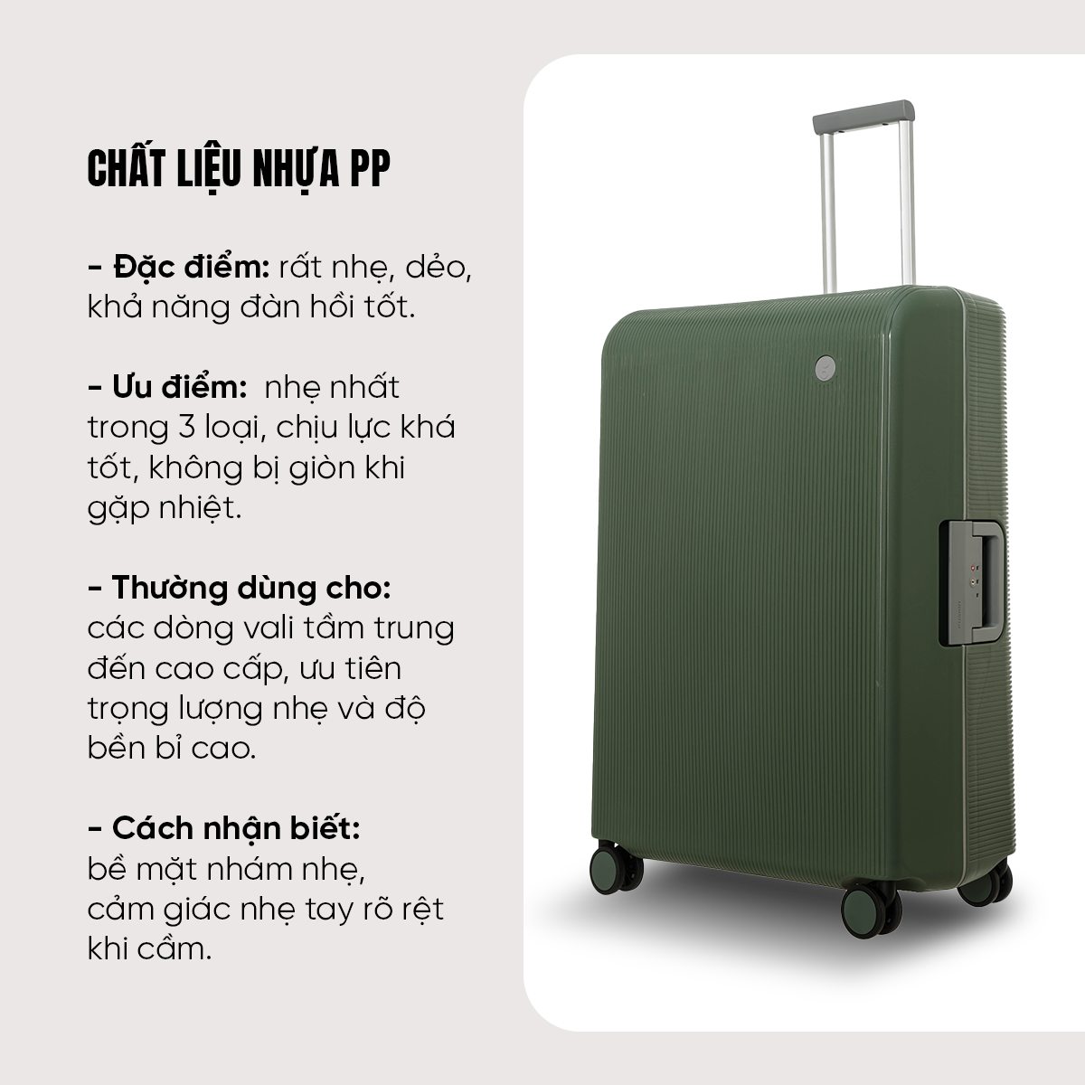 Nhựa PP nổi bật với đặc tính dẻo, nhẹ và bền, khả năng chịu lực và chống vỡ hoàn hảo. Vali nhựa PP ít bị nứt gãy, phù hợp với nhu cầu di chuyển thường xuyên. Dòng nhựa này ngày càng được ưa chuộng nhờ sự cân bằng giữa độ bền và trọng lượng, tuy nhiên thiết kế thường đơn giản hơn so với ABS hoặc PC.