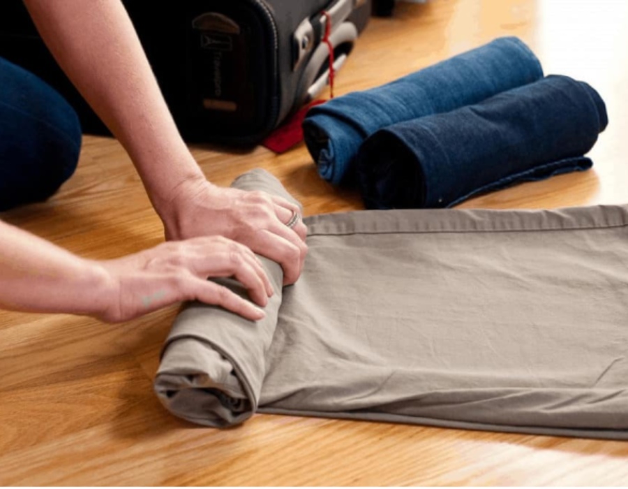 Thay vì gấp quần áo theo cách truyền thống, bạn hãy thử cuộn tròn từng món đồ. Cách làm này không chỉ giúp tiết kiệm diện tích đáng kể mà còn hạn chế nếp nhăn trên quần áo. Khi cuộn, quần áo sẽ được nén chặt hơn và có thể xếp chen khít vào các khoảng trống trong vali như giữa các đôi giày, cạnh túi đựng mỹ phẩm... Đây là mẹo được nhiều người đi du lịch lâu năm áp dụng vì vừa tiết kiệm không gian, vừa dễ lấy đồ mà không làm xáo trộn toàn bộ hành lý.
