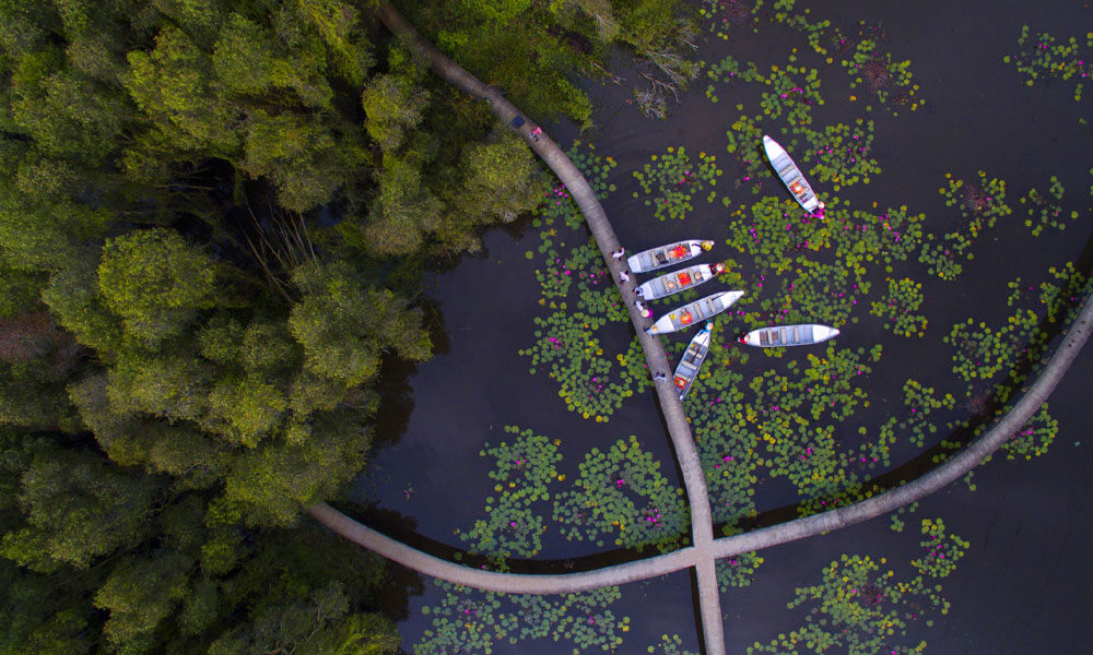 Hồ bán nguyệt như một viên ngọc bích nằm giữa lòng rừng tràm, với mặt nước trong xanh phản chiếu bóng cây. Những chiếc thuyền nhỏ neo đậu yên bình trên mặt hồ tạo nên một khung cảnh tĩnh lặng và thơ mộng. Du khách có thể thuê một chiếc thuyền nhỏ để dạo quanh hồ, tận hưởng không khí trong lành, ngắm nhìn những bông hoa súng, hoa sen khoe sắc và cảm nhận sự thư thái, yên bình mà thiên nhiên ban tặng.