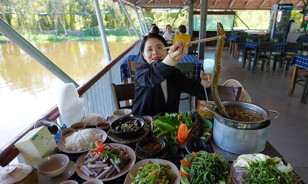 Tại làng nổi Tân Lập, bạn sẽ có cơ hội được thưởng thức những món ăn dân dã địa phương được chế biến vô cùng thơm ngon. Trong đó phải kể đến món lẩu cá thác lác khổ qua, cá lóc nướng trui ăn kèm rau sống và bánh tráng, cá linh chiên giòn thơm béo chấm với mắm me chua ngọt “ngon hết sảy”,... Ngoài ra, bạn cũng có thể ghé thăm vườn thanh long Châu Thành để tham quan thưởng thức tại chỗ và mua về làm quà tặng người thân.