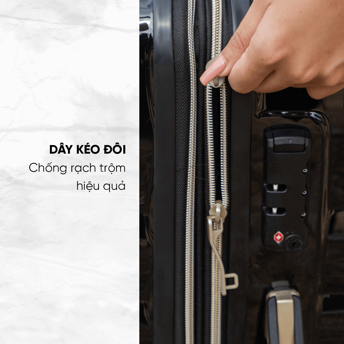 Tăng độ bảo mật với hệ thồng khoá kéo vali 2 lớp chắc chắn, hạn chế tác động của vật nhọn, giảm thiểu rủi ro bị rạch trộm hành lý.