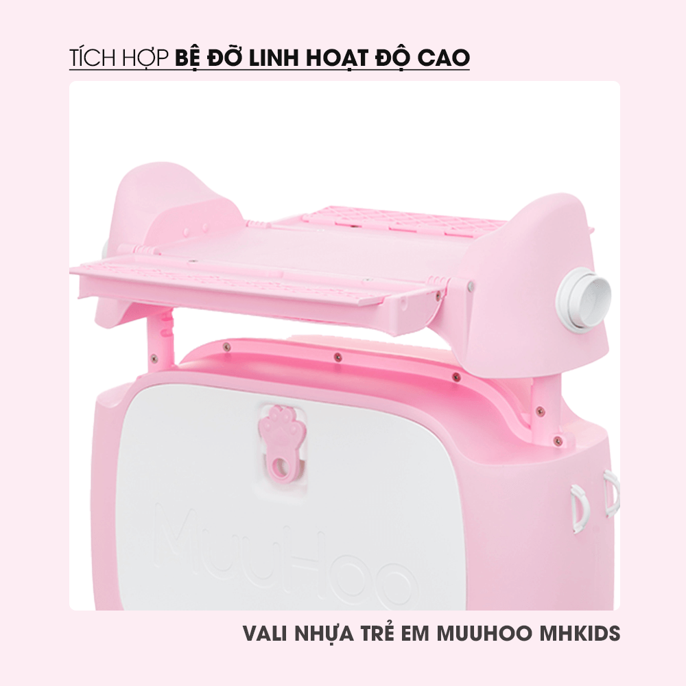 Vali Muuhoo MHKIDS có thiết kế thông minh, tích hợp bệ đỡ có thể thay đổi linh hoạt chiều cao theo nhu cầu sử dụng. Kết hợp cùng nệm cao su cao cấp siêu đàn hồi có sẵn trong vali, bệ đỡ có thể dùng như chỗ ngồi cho bé khi kéo vali trên đường. Hoặc nâng cao bệ đỡ ngang tầm ghế ngồi trên những chuyến xe, chuyến tàu để làm giường ngủ nhỏ cho bé trong chuyến đi dài giờ.