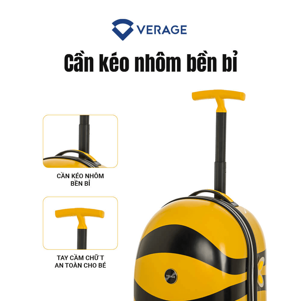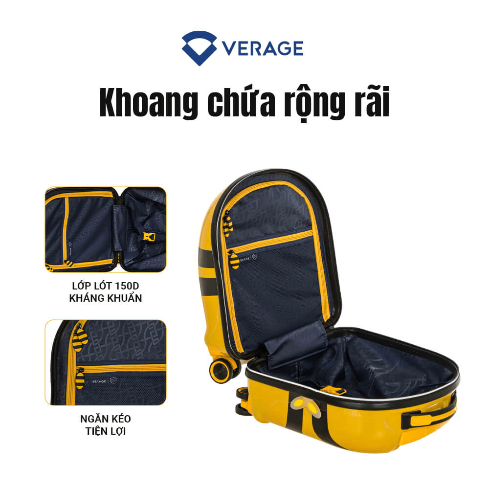 Chiếc vali hoàn hảo cho bất kỳ du khách nhí nào đam mê khám phá. Verage GM20056W được thiết 2 màu đen và vàng, như hình ảnh của những con ong sống động và đáng yêu. Một nét độc đáo của vali Kid Verage GM20056W là hình dạng cánh ong nhỏ mang lại sức sống mới, sự phá cách cho chiếc vali.