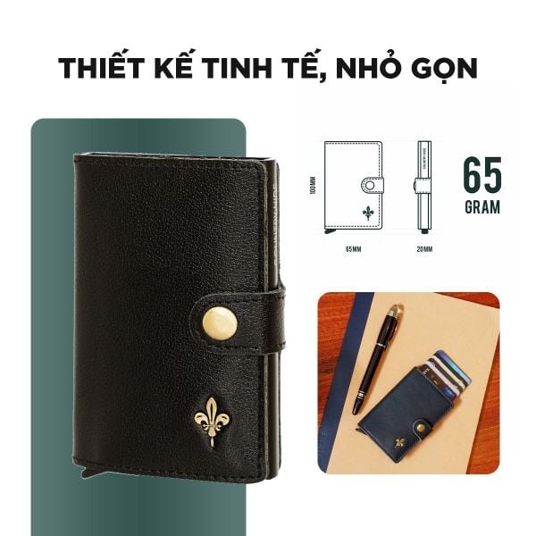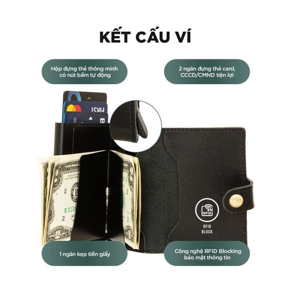 Kết cấu ví gồm: - 1 hộp đựng thẻ thông minh có nút bấm tự động - 2 ngăn đựng thẻ card, CCCD/CMND tiện lợi - 1 ngăn kẹp tiền giấy - Tích hợp công nghệ RFID Blocking hiện đại giúp bảo mật thông tin các thẻ (chip,ATM,...) một cách tối ưu. - Kích thước: 9.5x6.5x2cm